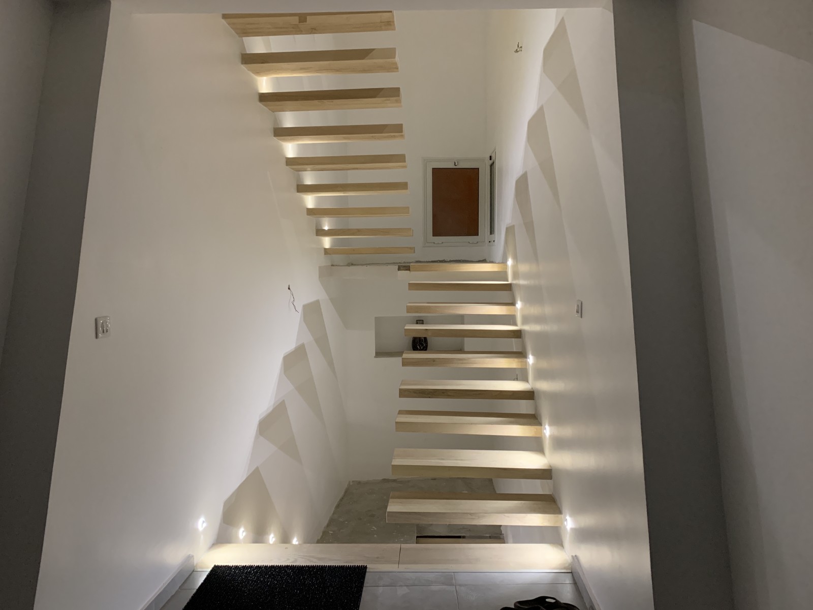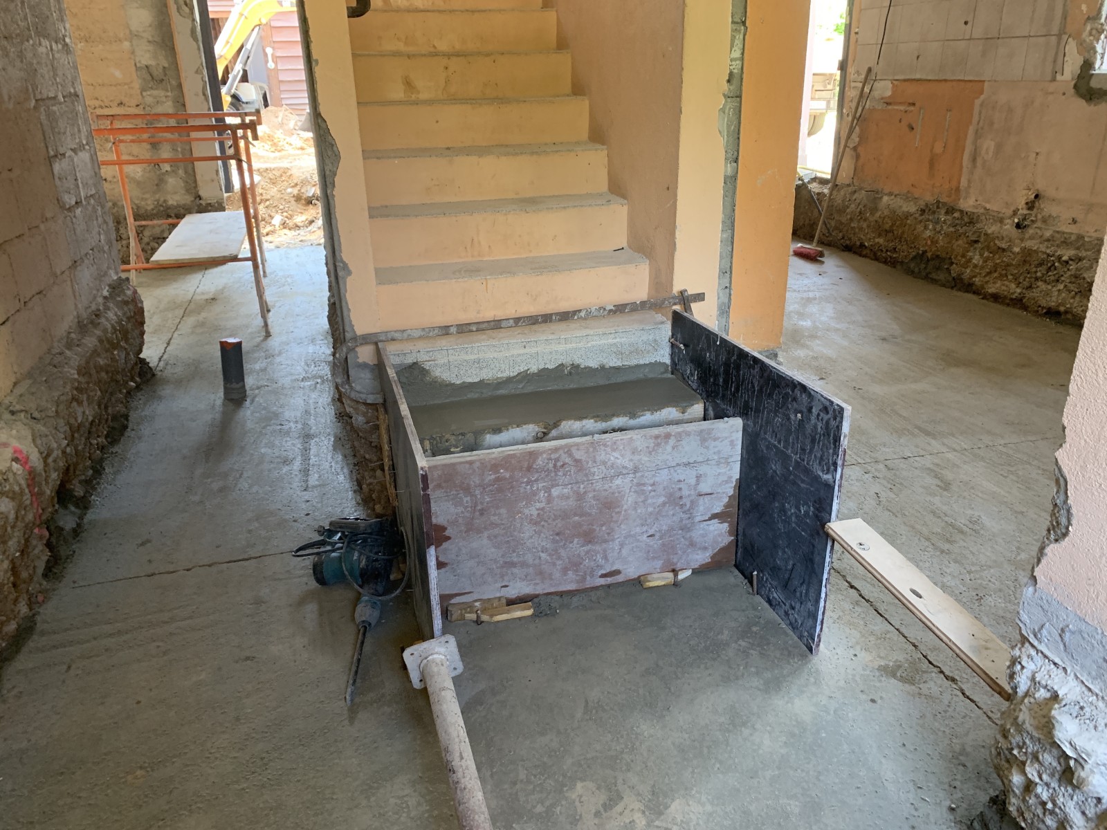 Un IPN métallique de 20 cm sur 360 cm a été intégré avec appui sur murs extérieurs porteurs. Le chantier incluait également la création d'une trémie pour escalier, la pose d’un poteau béton 200 x 200 mm (dosé à 300 kg de ciment/m³) et le rebouchage d’une trémie existante avec béton coffré selon recommandations d’ingénieur béton.