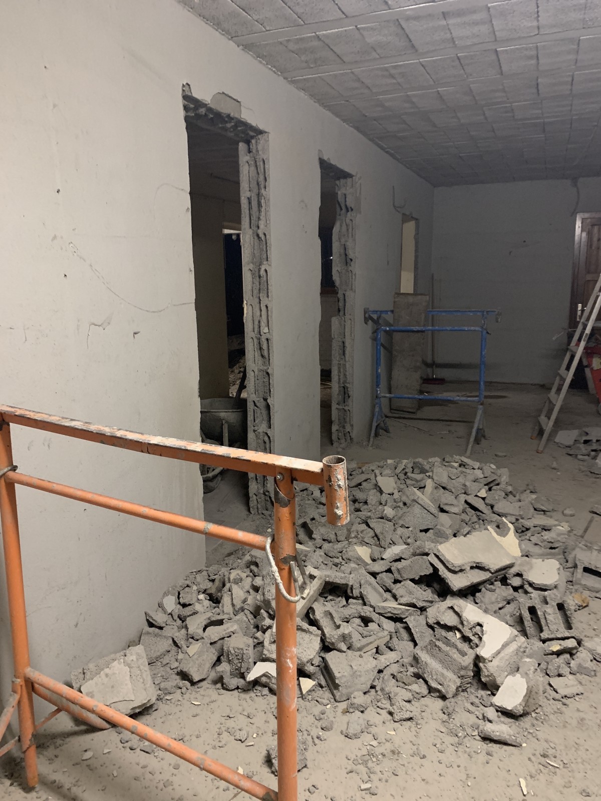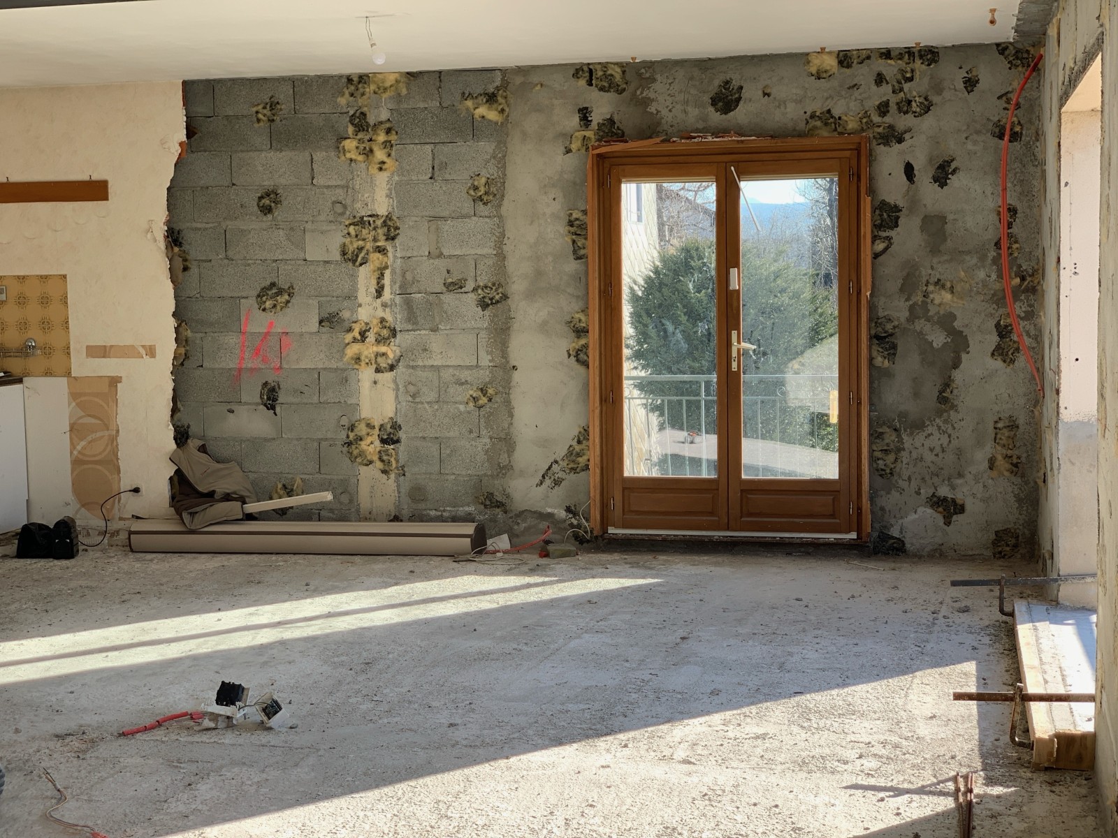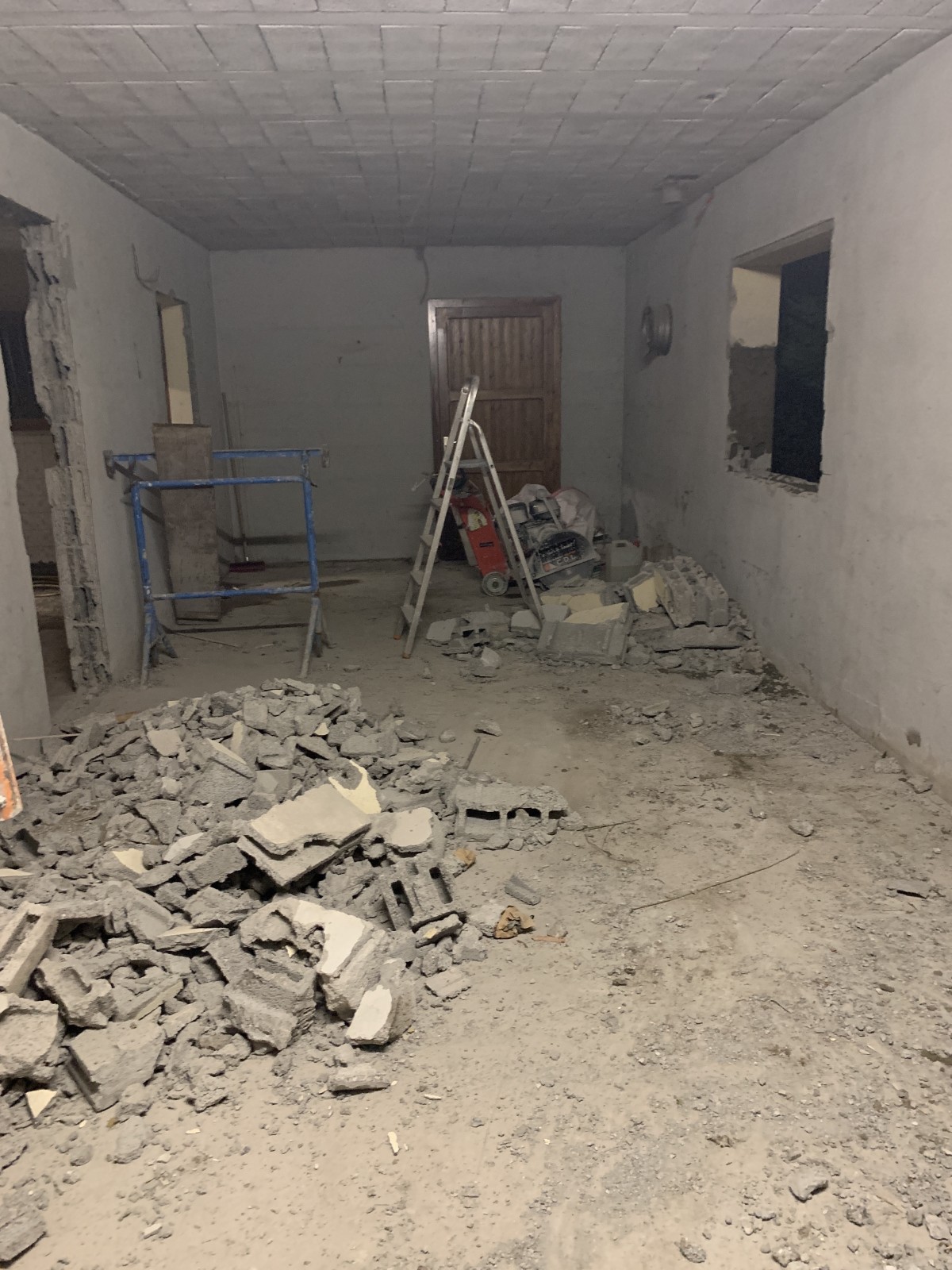 Les travaux ont débuté par une démolition manuelle complète des cloisons, de la cheminée, et du carrelage (46 m²), avec traitement des gravats en déchetterie. Des bennes ont été installées pour évacuation, pour un coût de 2 500 € HT.