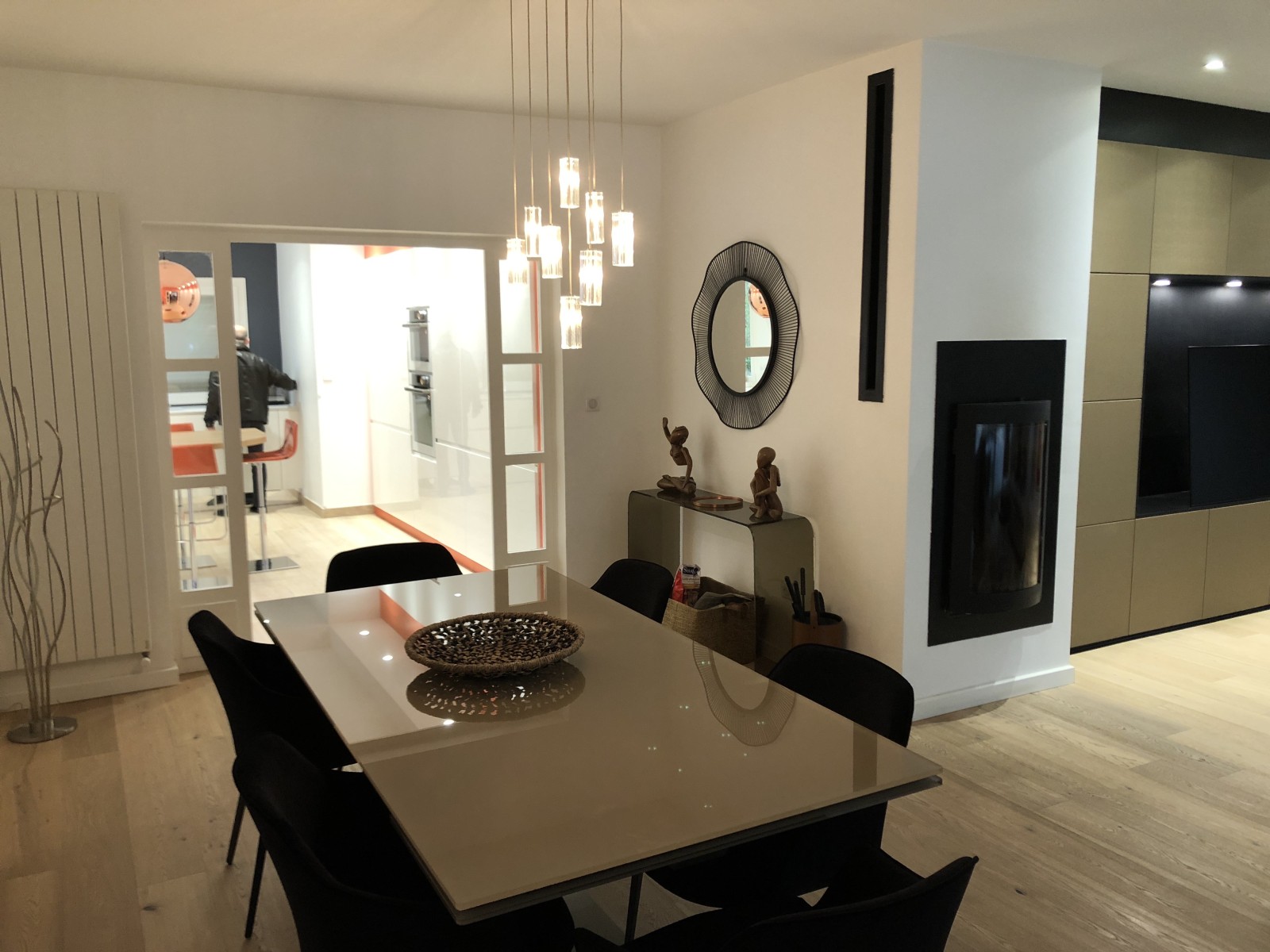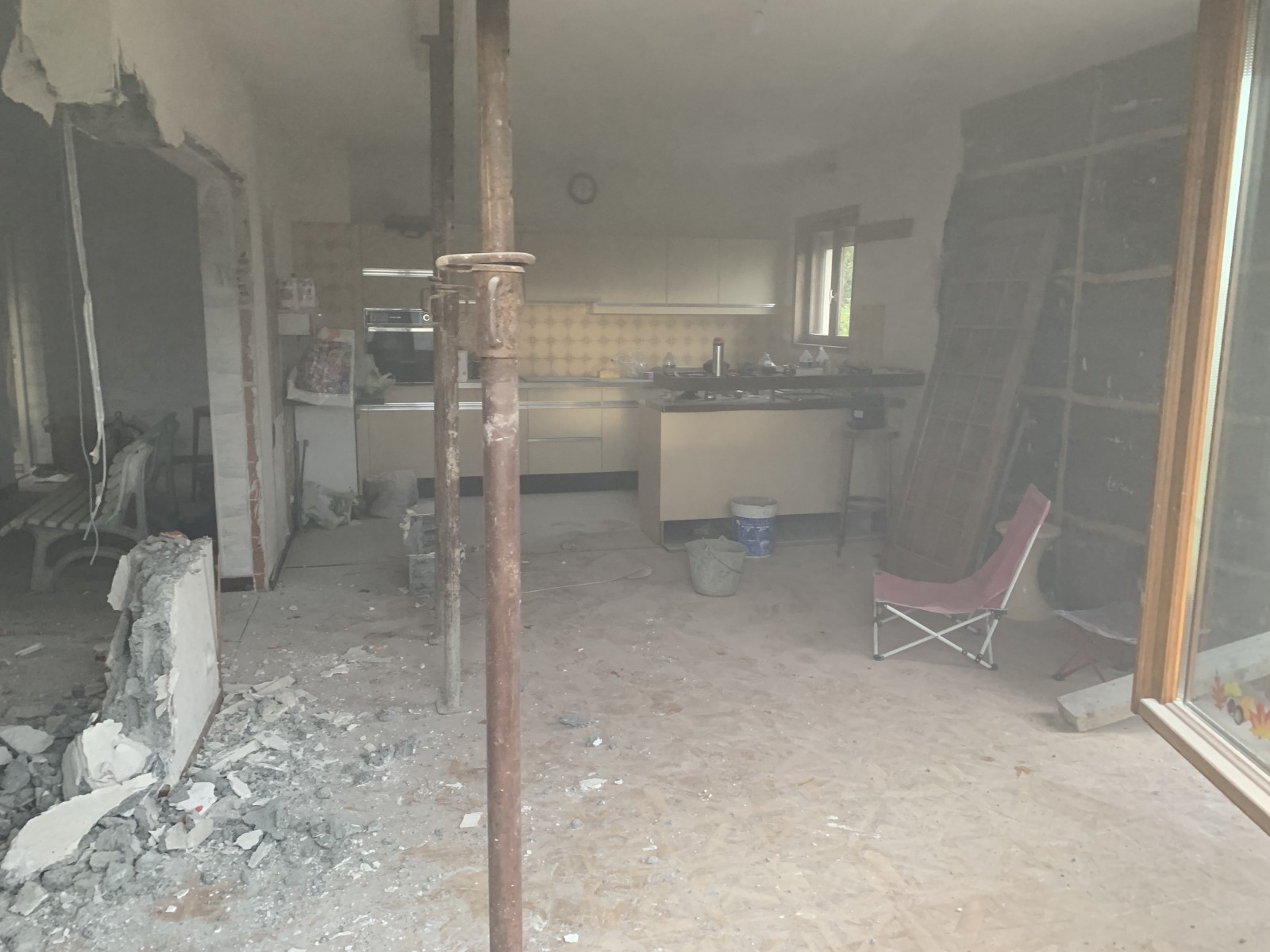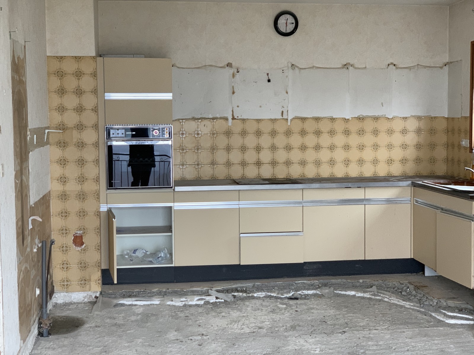 Les travaux ont débuté par une démolition manuelle complète des cloisons, de la cheminée, et du carrelage (46 m²), avec traitement des gravats en déchetterie. Des bennes ont été installées pour évacuation, pour un coût de 2 500 € HT.